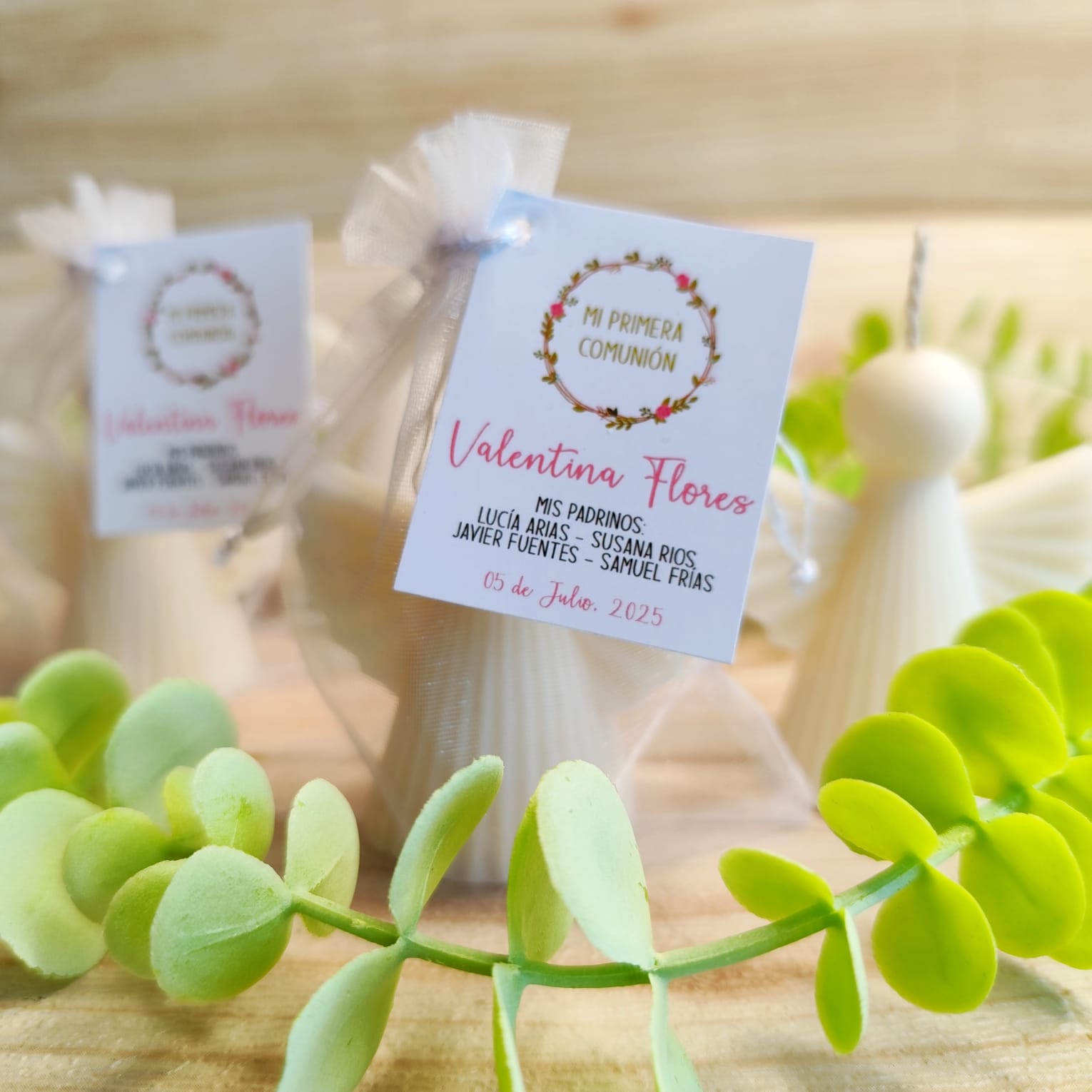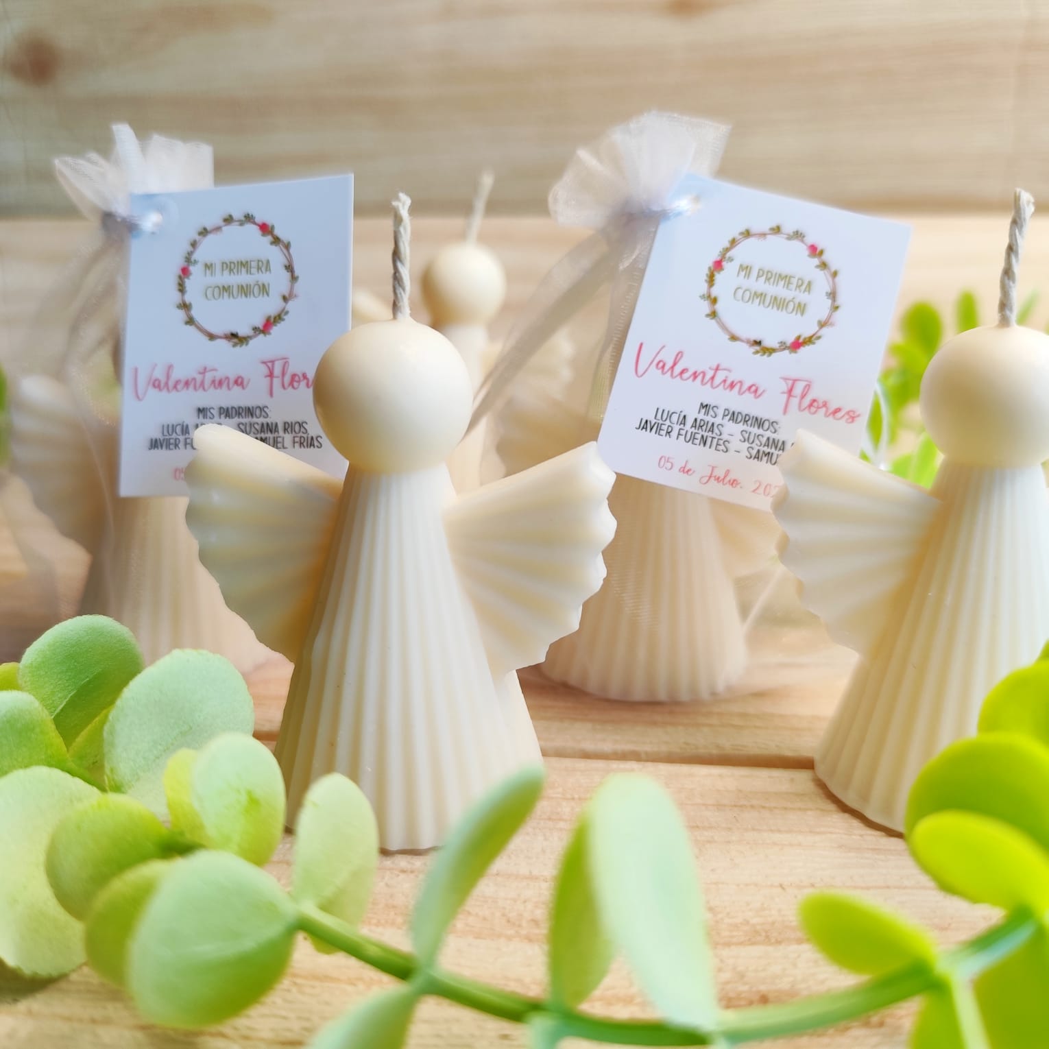 Vela en forma de ángel, creada para acompañar momentos espirituales y significativos como bautizos, primeras comuniones o confirmaciones.