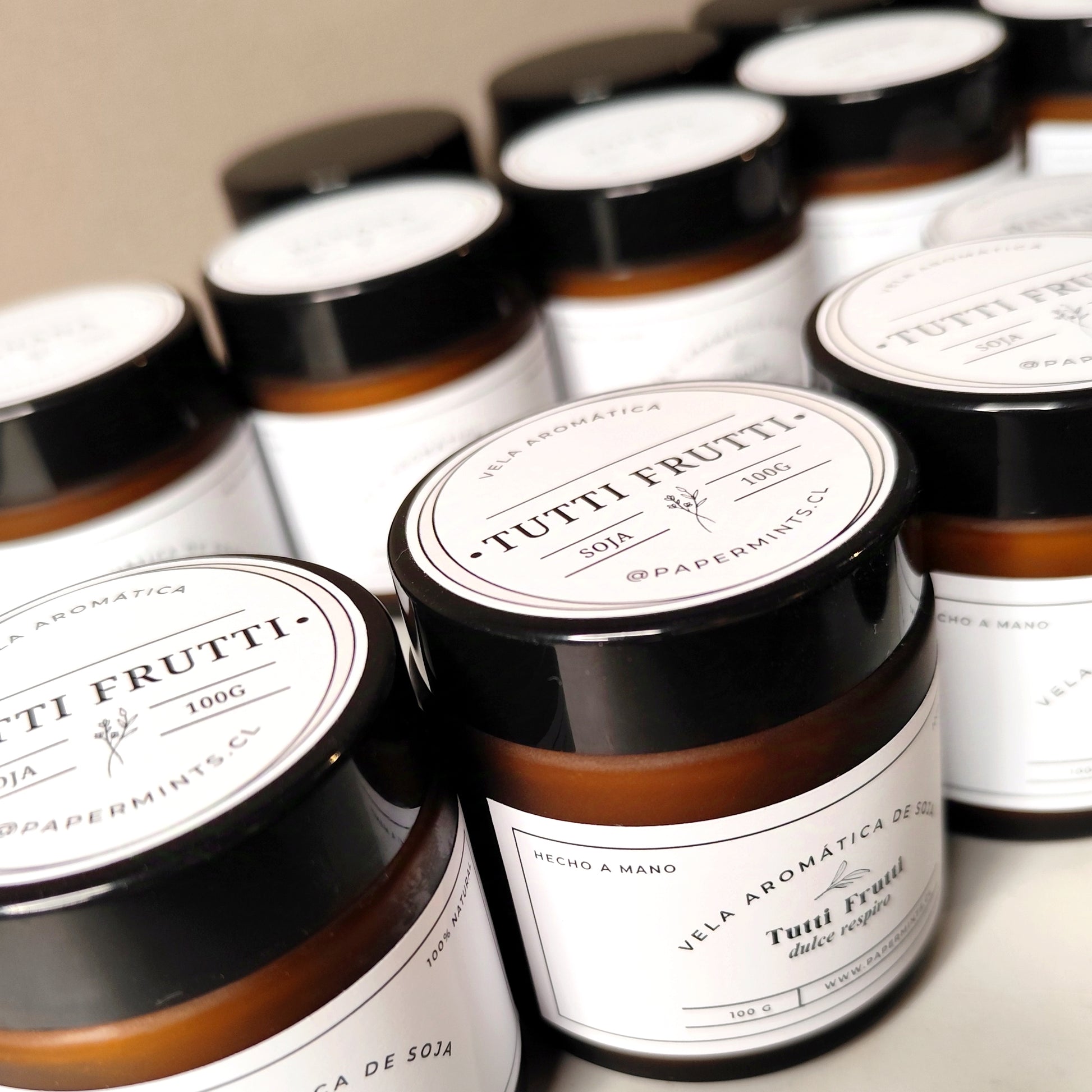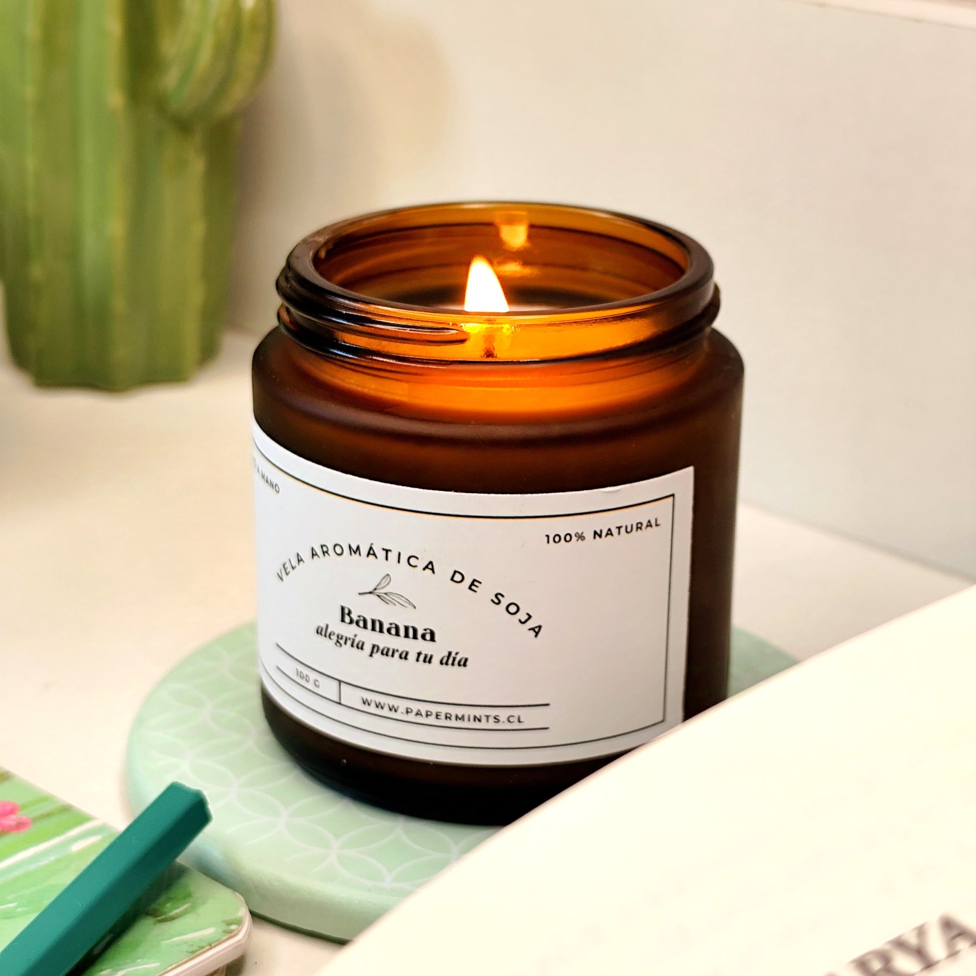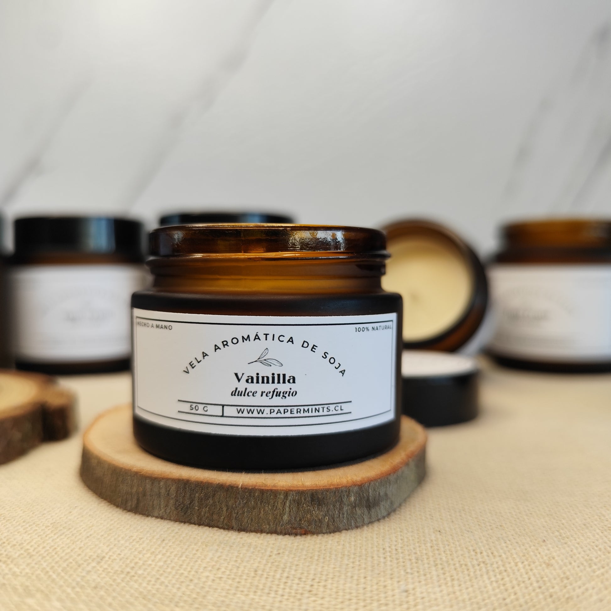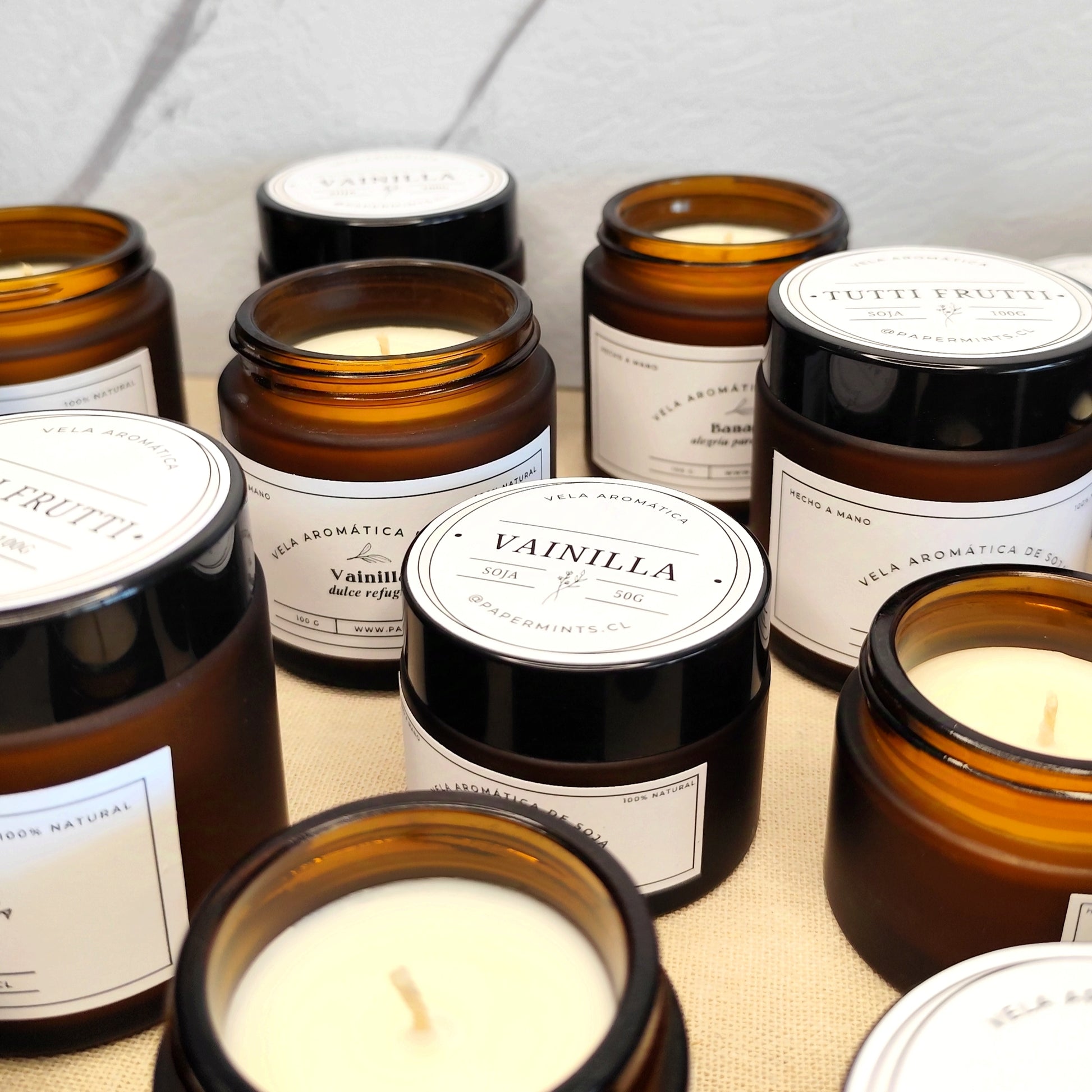 Velas de soja, en frasco ámbar.